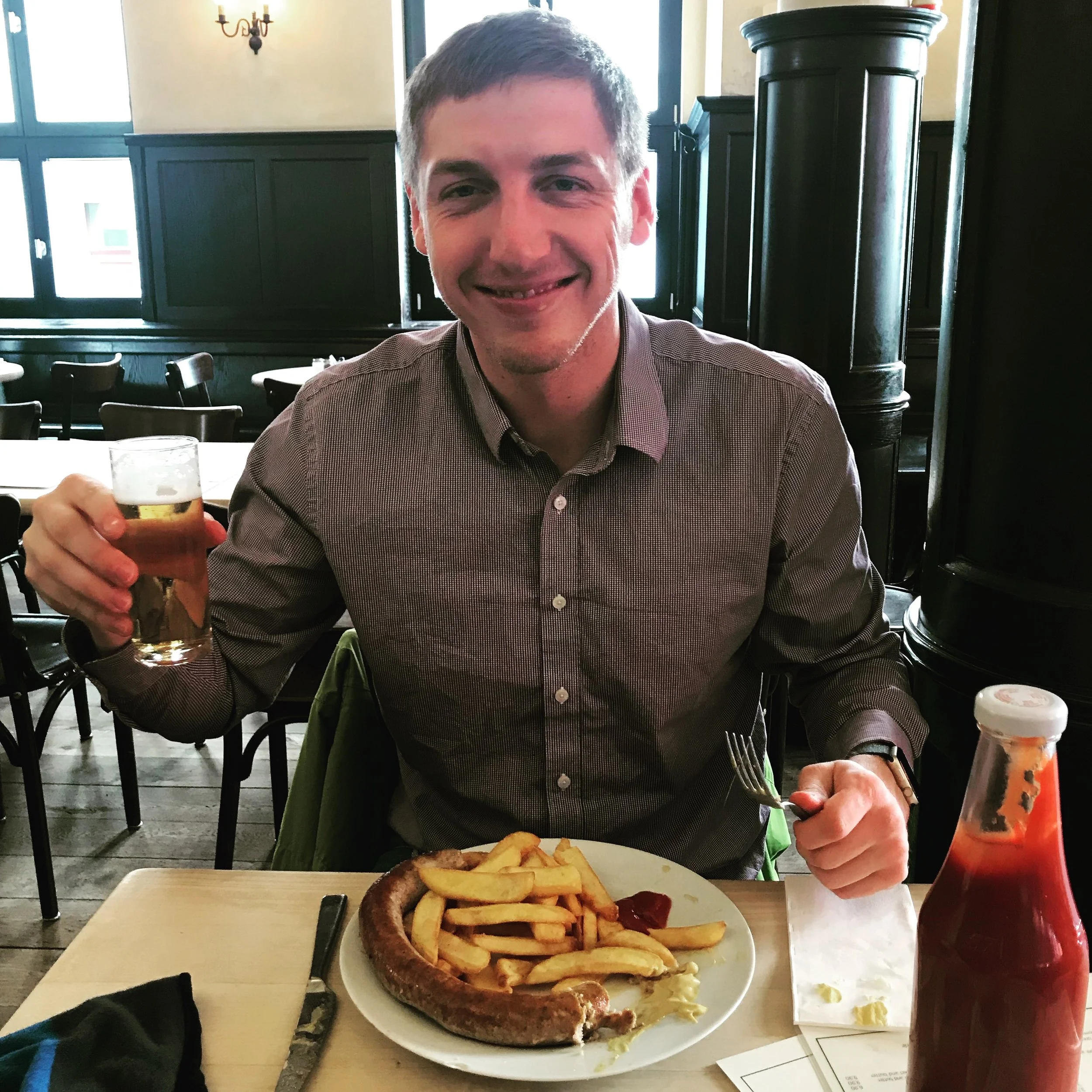 After exploring the cathedral, I indulged in the local tradition of drinking Kölsch from Kölsch rings. These are trays specifically designed to hold multiple small glasses of Kölsch beer, which is traditionally served in 0.2-liter cylindrical glasses known as "Stangen." The crisp, refreshing beer, served in these small, straight glasses, was a perfect accompaniment to the lively atmosphere of the beer halls. An interesting custom in Cologne is that the waiters, known as "Köbes," mark a tick on your coaster for each glass of Kölsch you have. This unique tally system continues until you place your coaster on top of your glass, signaling that you are done.